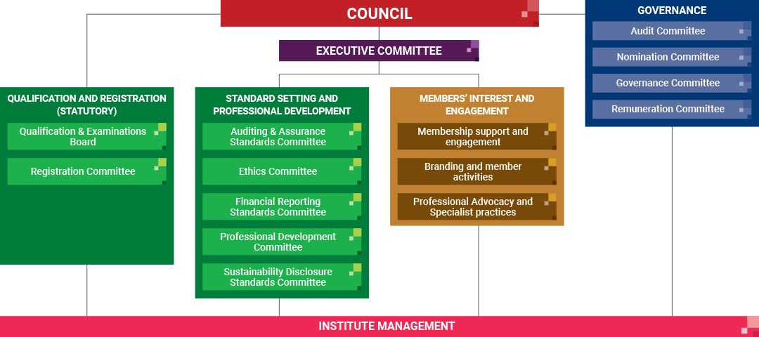 The Council is supported in its activities by various committees, primarily made up of Institute members. The committees are essential in ensuring the operationalization of the Institute’s corporate governance framework. These also ensure that the operations of the Institute’s management and other committees are aligned with the strategies and policies set by the Council.