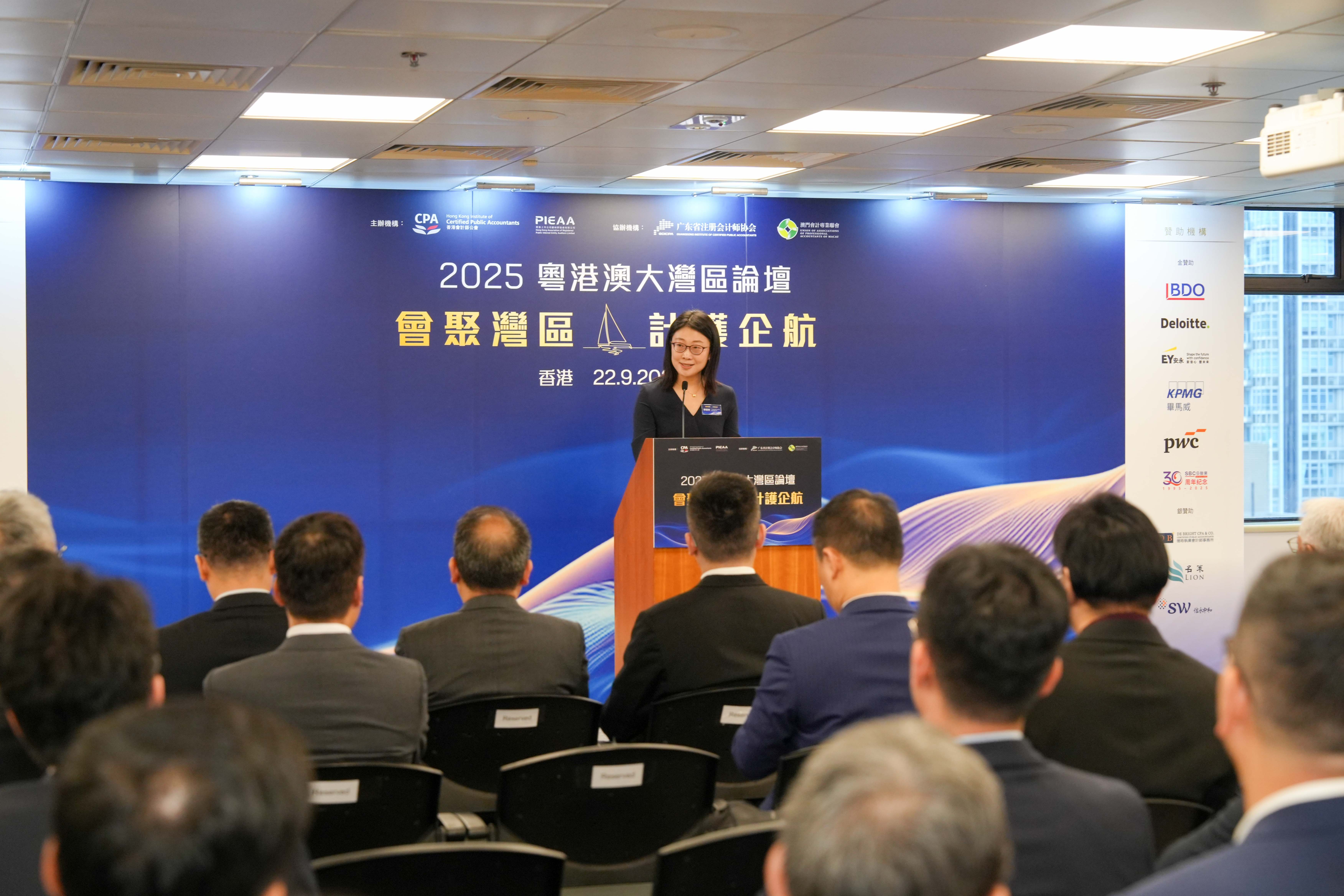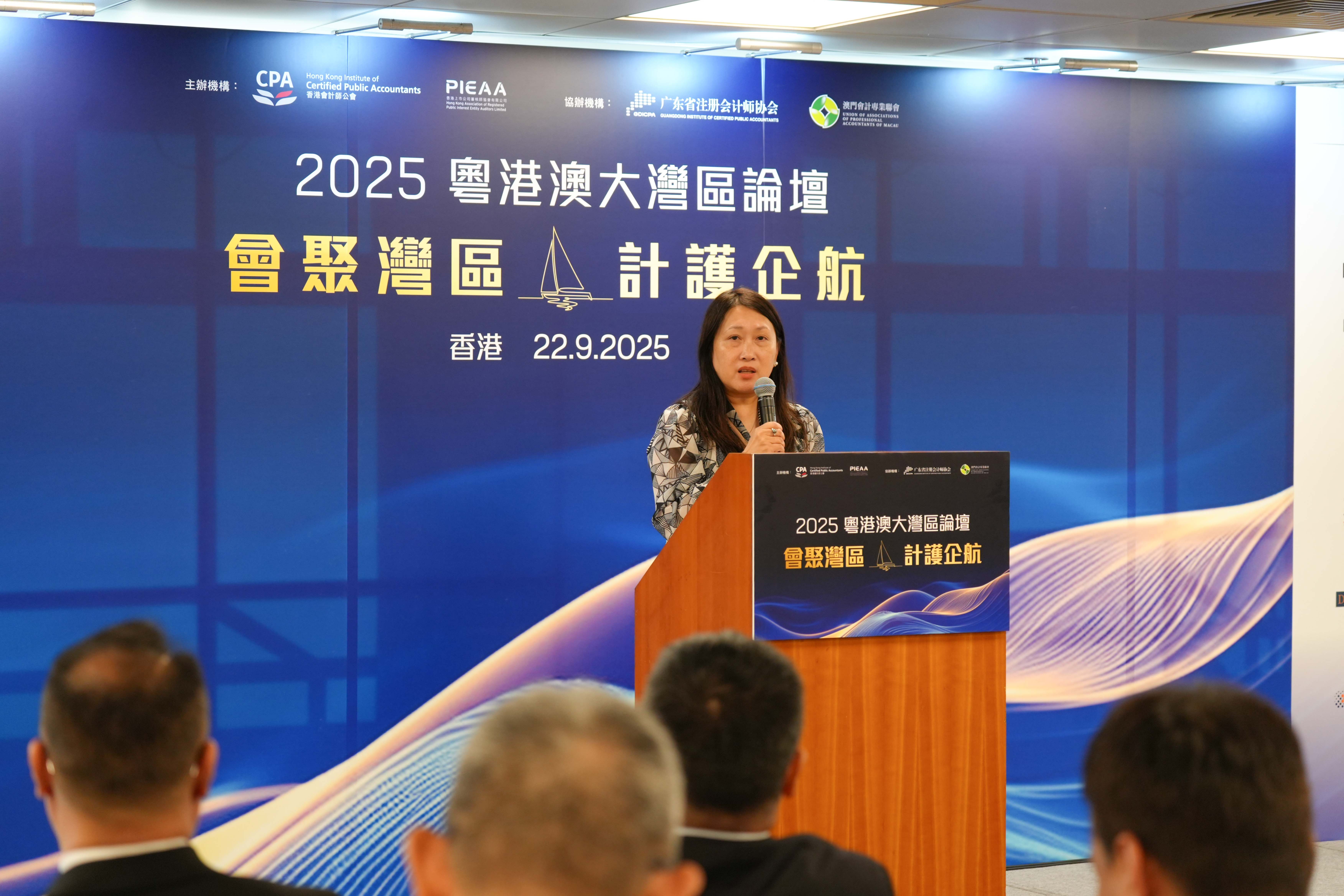 香港會計師公會副會長、香港上市公司審核師協會理事會成員李舜兒為論壇致閉幕辭,感謝三地政府、會計專業機構、贊助機構、演講嘉賓和會計同業的支持,並表示:「今天,我們匯聚了來自粵港澳大灣區逾250多位會計同仁,這不僅彰顯了區域同行的緊密團結與深厚情誼,更藉此建立了互信,凝聚了共同應對挑戰的力量。衷心希望這次論壇成為大家恆常交流的平台,讓不同的思想得以碰撞,珍貴的聯繫得以建立,潛在的商機可以把握。我們期盼以此為起點,將論壇中凝聚的智慧與共識,轉化為未來實際行動的動力。」
