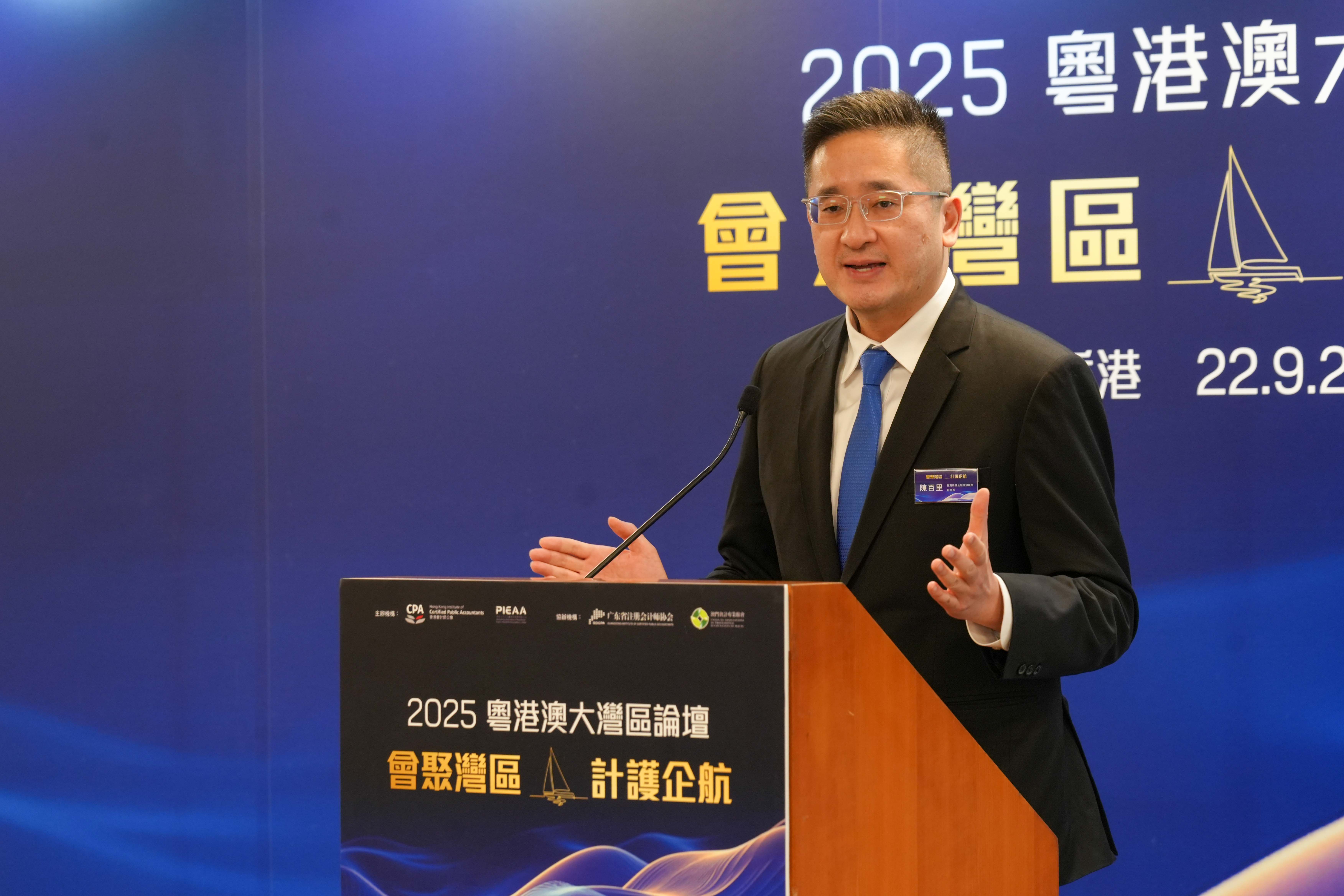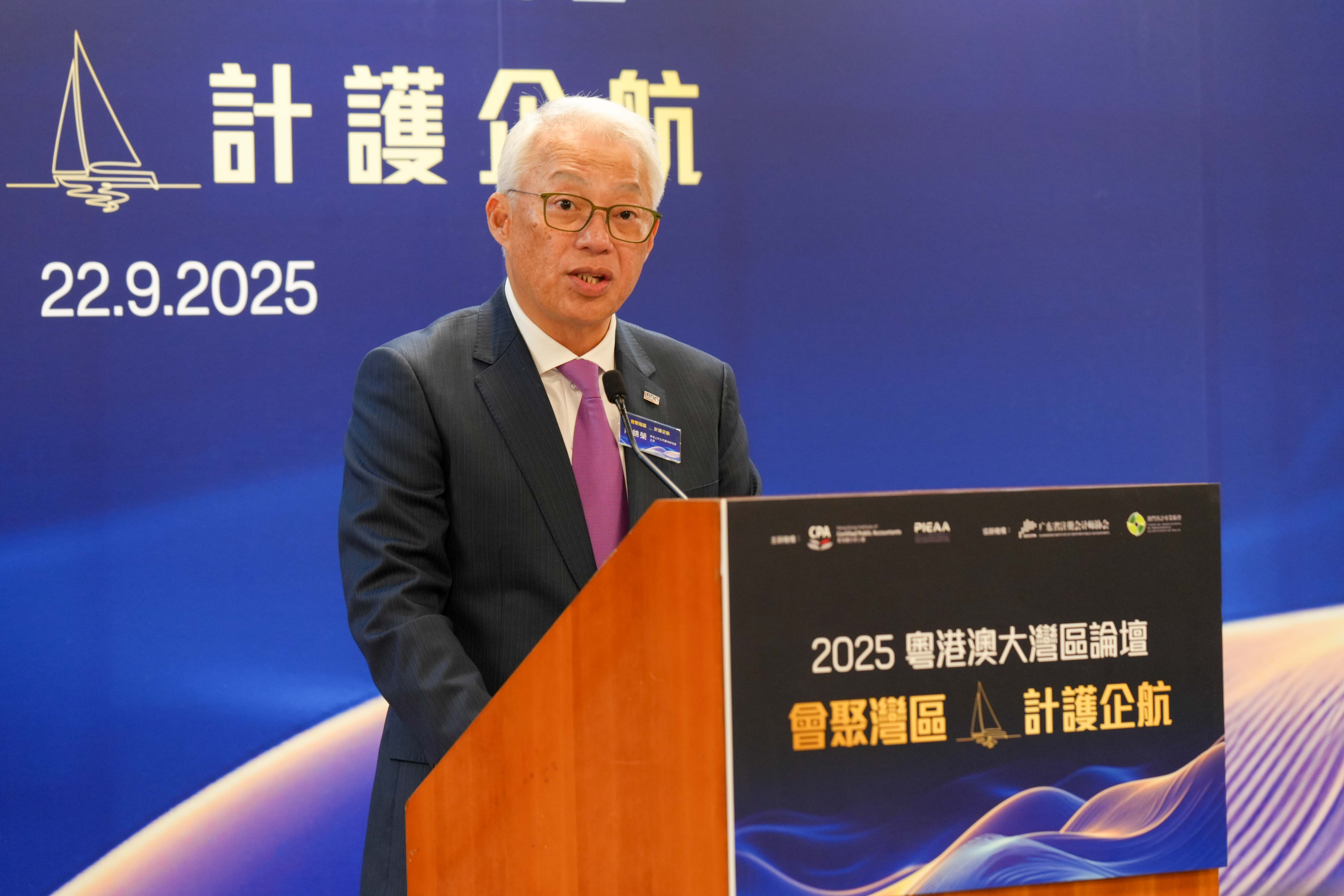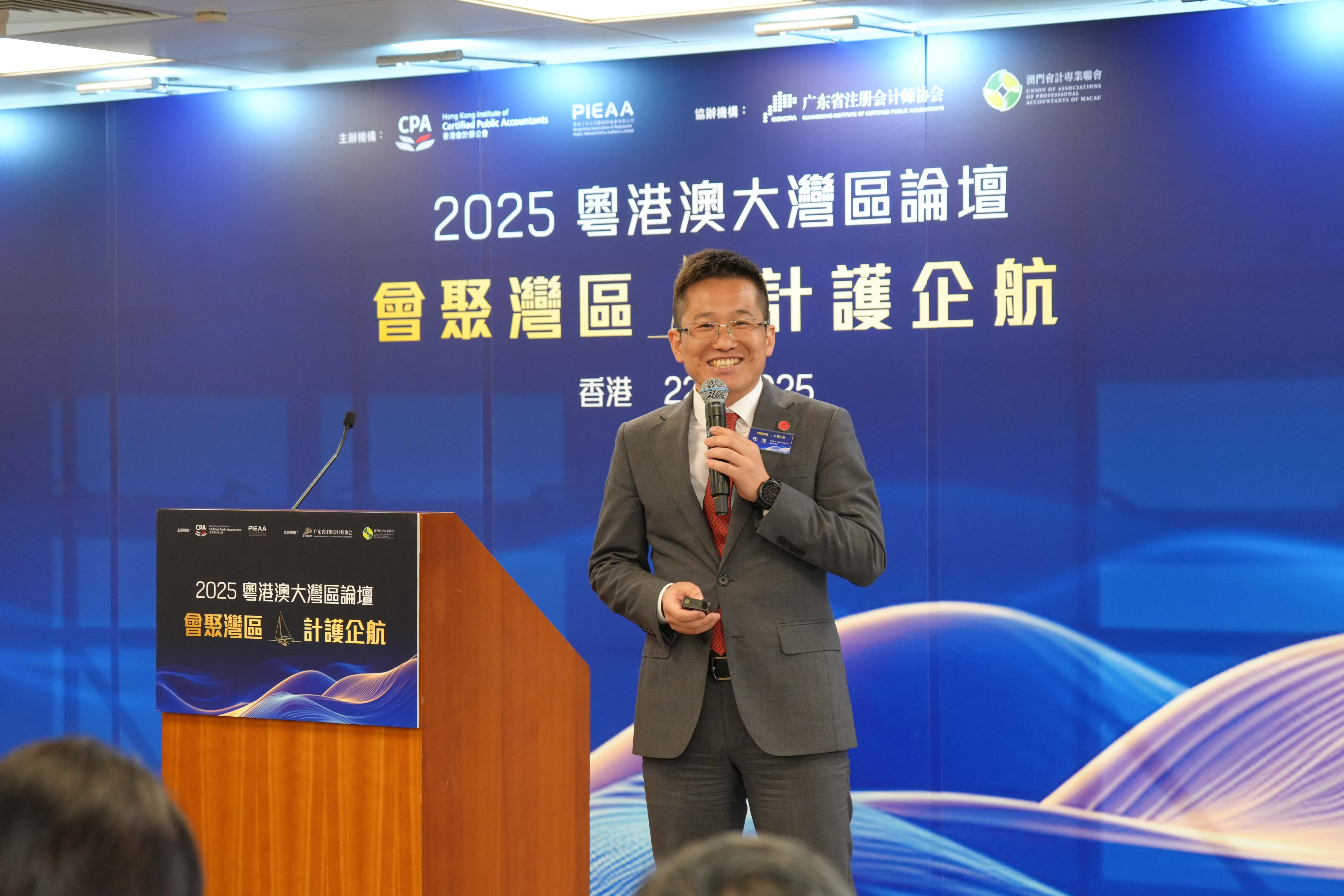 香港會計師公會會長歐振興在致辭中表示:「企業『出海』離不開專業服務的支持,其中會計專業服務更是扮演關鍵角色。此次論壇以『會聚灣區 · 計護企航』為主題,正是希望凝聚大灣區會計行業的專業力量與資源,助力企業在複雜的地緣政治和經濟環境中穩健前行,把握發展機遇。」