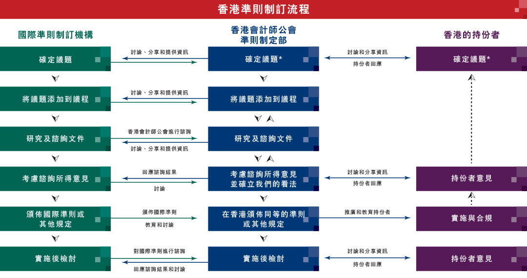 经过就趋同问题进行广泛磋商后,在2000 年代初,香港会计师公会理事会决定香港准则应与国际准则全面趋同。我们的正当程序文件解释我们制订和采用国际准则的程序。制订准则的过程如下图所示。