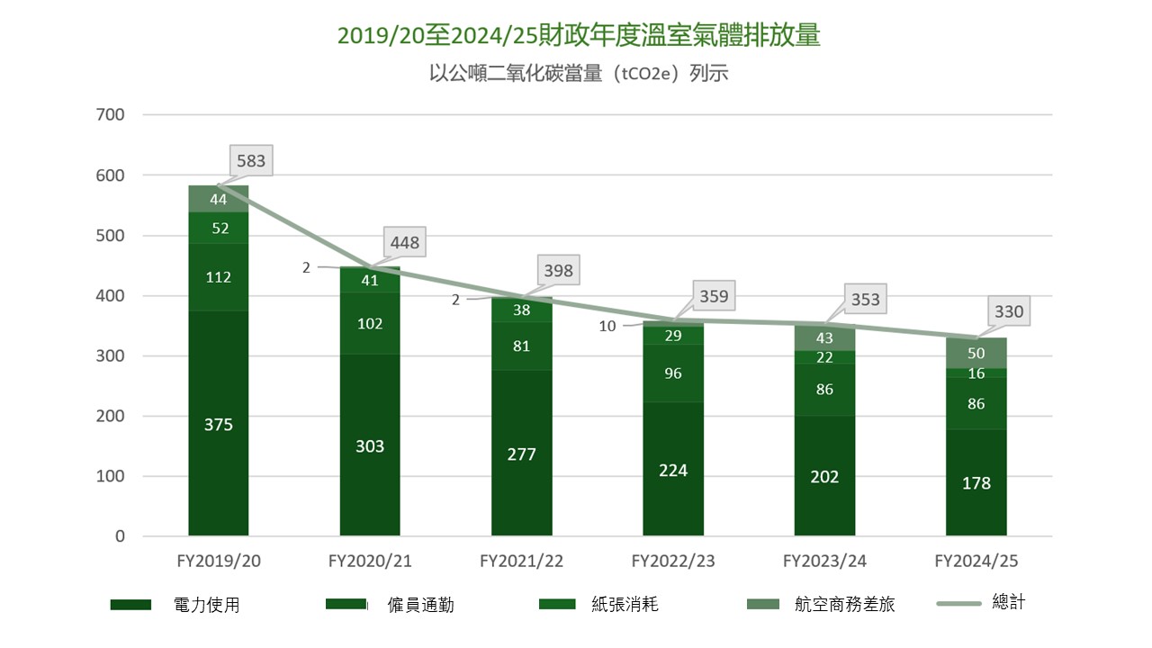於2024/25財政年度,溫室氣體總排放量為330公噸二氧化碳當量,較2023/24財政年度的353公噸二氧化碳當量減少7%,較2019/20財政年度的583公噸二氧化碳當量減少43%(見下圖)。