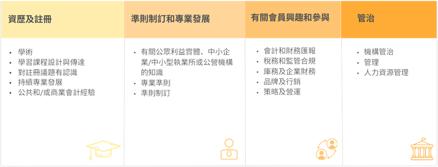 為了實現適合每個委員會成員的多樣性,公會將考慮任命委員會成員的相關因素: