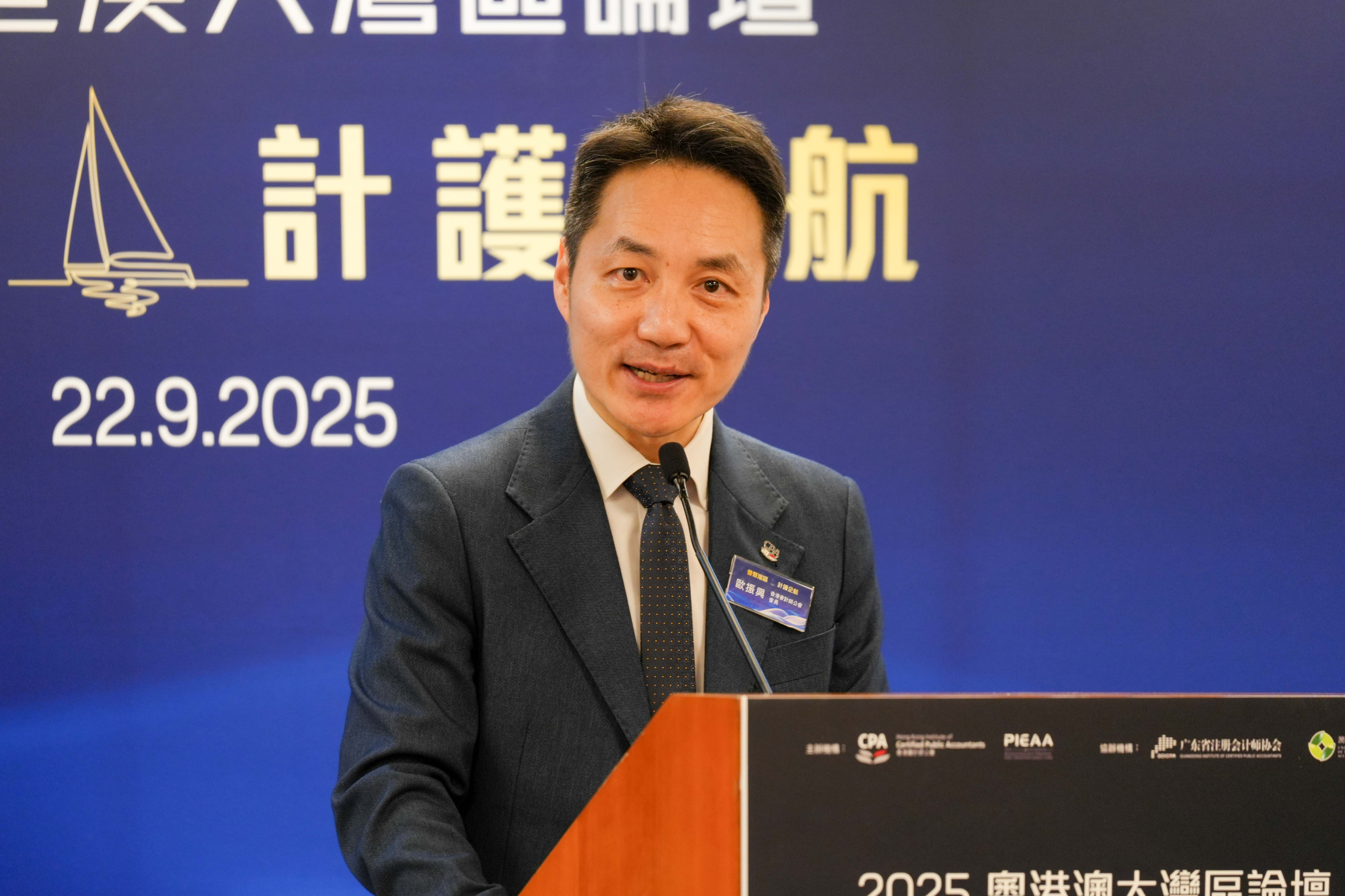 香港會計師公會會長歐振興在致辭中表示:「企業『出海』離不開專業服務的支持,其中會計專業服務更是扮演關鍵角色。此次論壇以『會聚灣區 · 計護企航』為主題,正是希望凝聚大灣區會計行業的專業力量與資源,助力企業在複雜的地緣政治和經濟環境中穩健前行,把握發展機遇。」
