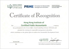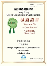 | 公會獲環境運動委員會香港綠色機構認證計畫頒發基礎級別Wastewi$e證書。這張證書認可了我們在採取減少廢物措施以促進綠色辦公室方面所做的努力。我們將繼續努力採用綠色採購、內部監控以及與持份者的持續溝通,在未來實現更多的環保目標。 |  |
