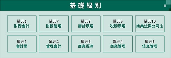基礎級別由十個單元組成,旨在為學生提供解決會計、財務、管理會計、法律和審計等領域的日常專業問題的核心專業知識和應用技能基礎,使他們能夠晉升到專業級別。這十個單元分別是: