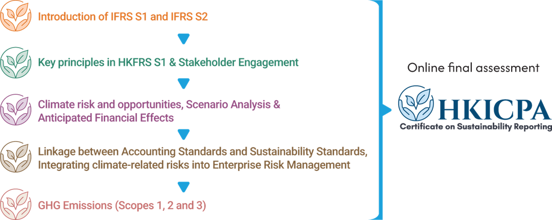 The HKICPA Certificate on Sustainability Reporting consists of five modules and a final assessment. A knowledge assessment check will be provided to reinforce participants' knowledge after completing each module, and each assessment must be passed to unlock the next topic.